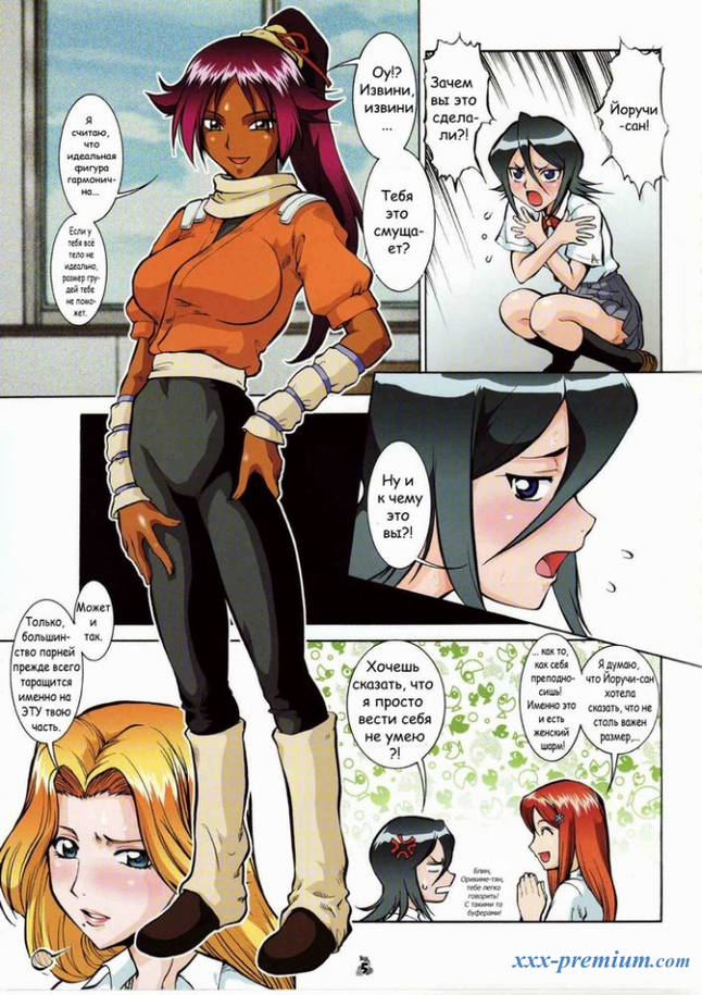 Две девушки стоят вплотную друг к другу и трутся сиськами. - Орихиме... Рангику - сан. Эй, что вы.. Что всё это значит?- Рангику - сан хотела сравнить размеры наших грудей. Она хотела примерить кое что из моей одежды, но не знала, подойдет ли размер...