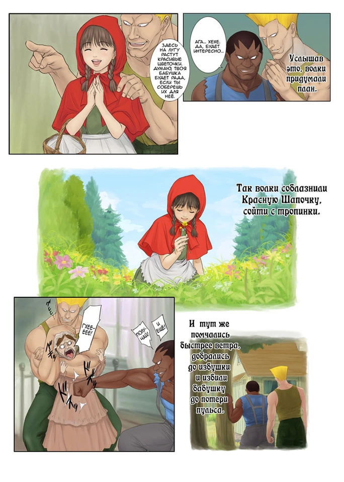 Хентайная версия известной сказки о Красной Шапочке. Веселый порно комикс на русском языке. Повествует о том как серый волк стал любовником красной шапочки. Они весело проводят время: волк ебет красную шапочку, лижет письки ее подружкам попутно спасая сказочный мир от черной шлюховатой ведьмы.